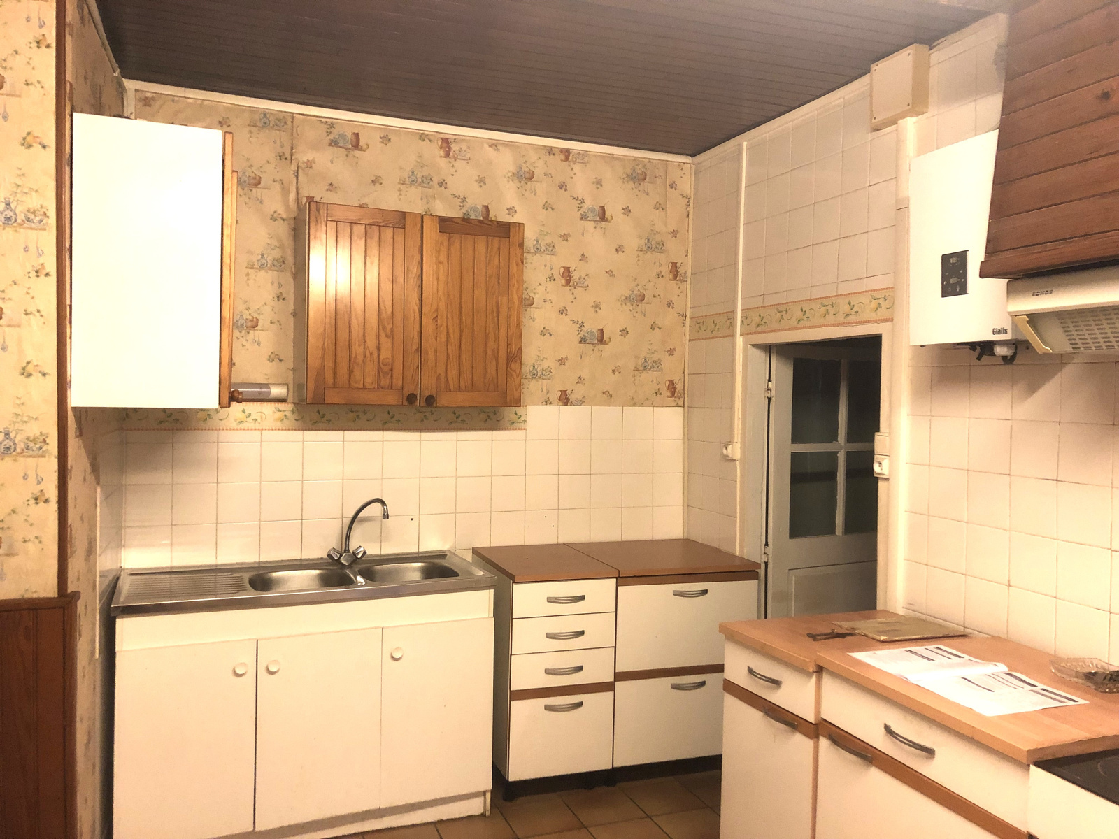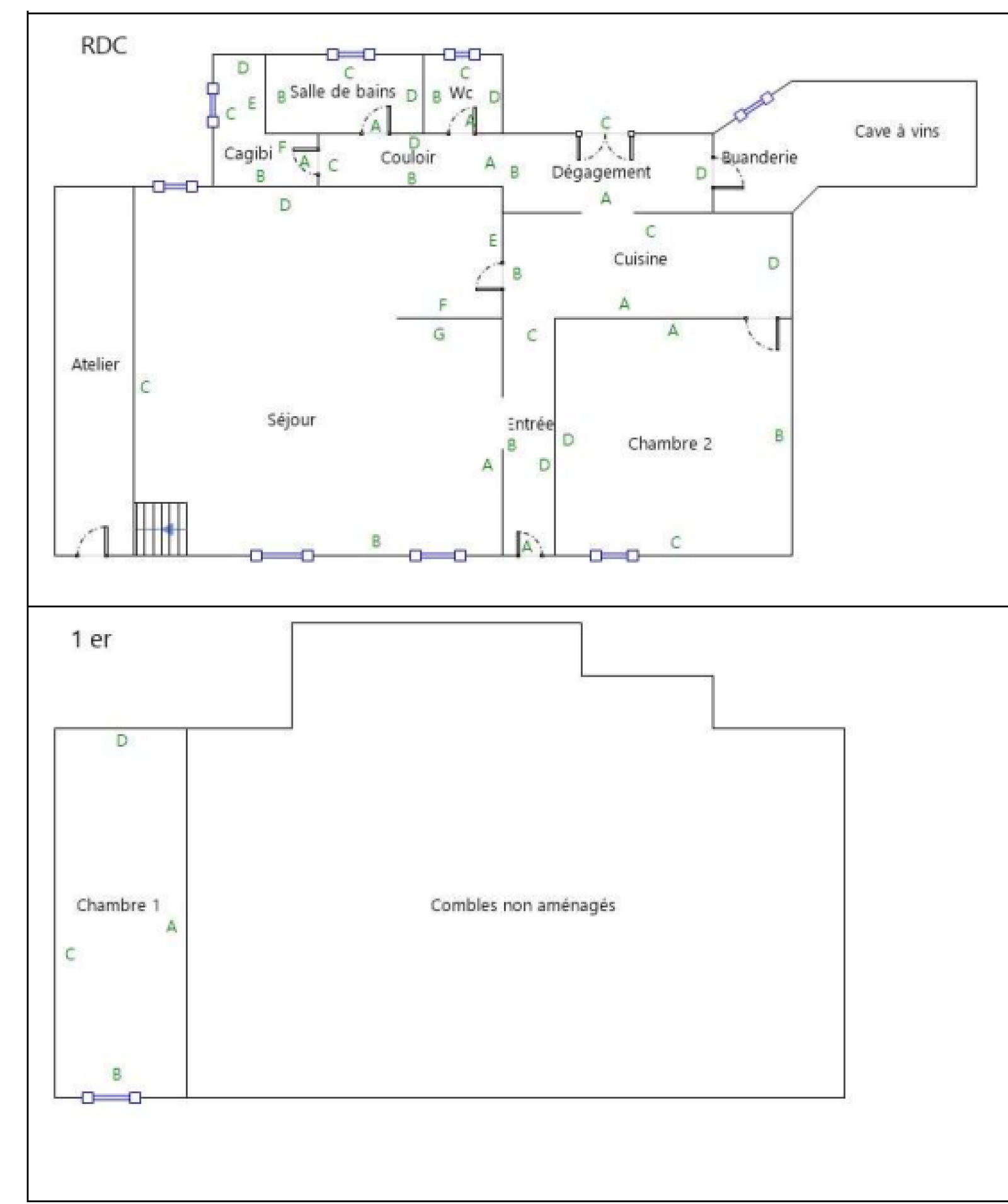 Entrée, cuisine, salon/séjour, 2 chambres, salle de bains, WC, buanderie, cave